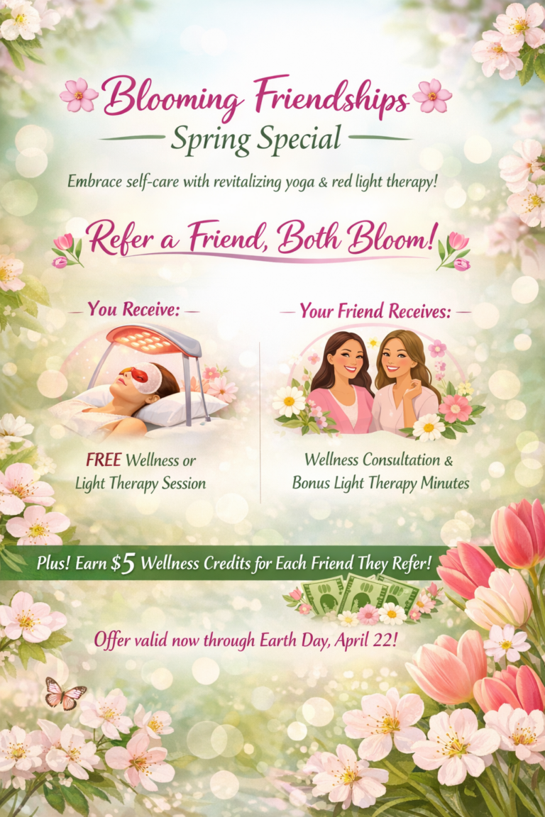 Our Blooming Friendships Spring Special invites you to embrace self-care through rejuvenating yoga wellness sessions and restorative red light therapy designed to support relaxation, skin health, and overall vitality.